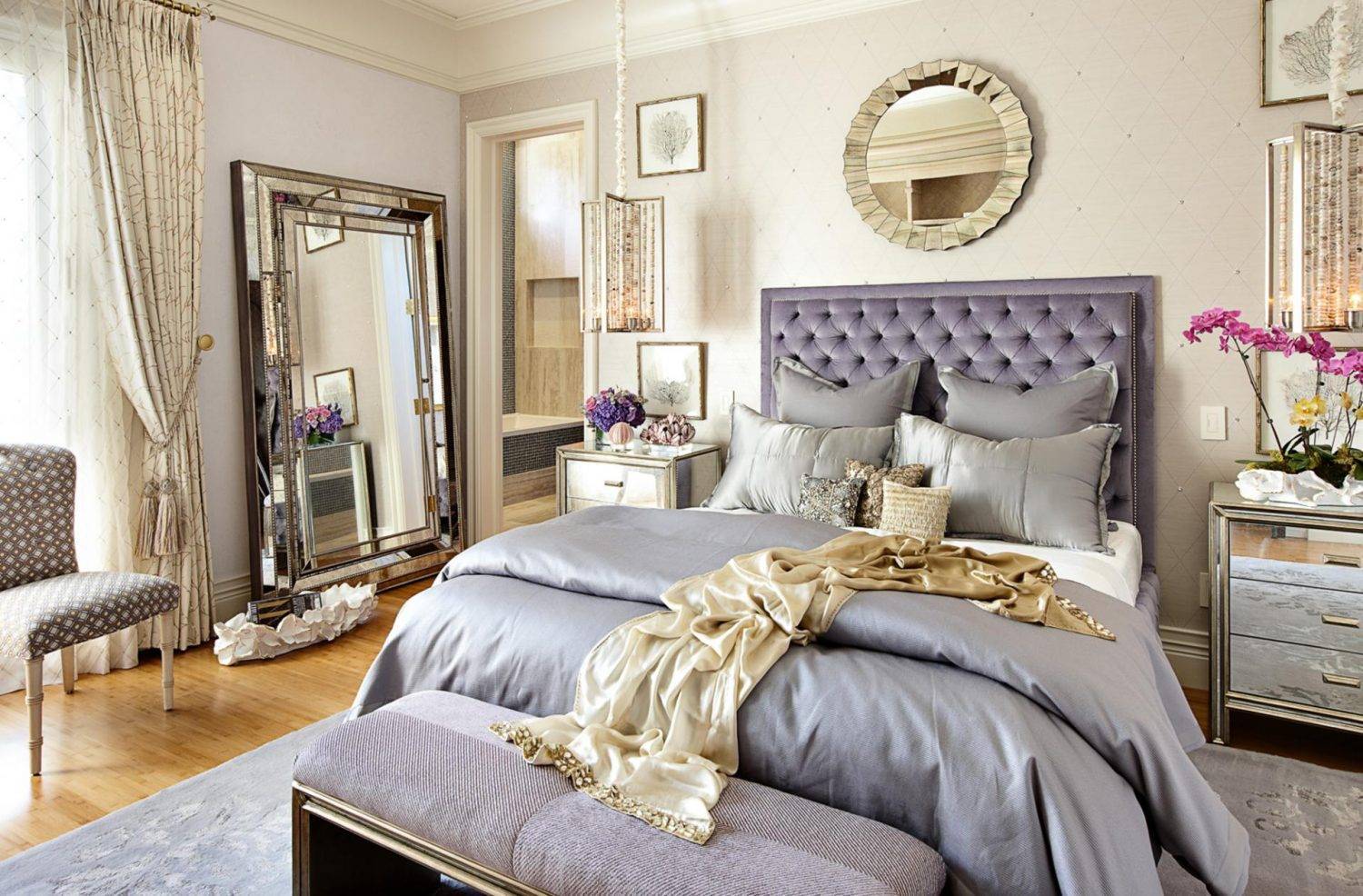 Напольное зеркало в золотой раме в спальне